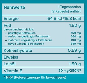 Leinöl 67% (Herkunft EU), Vitamin E, Antioxidans: Rosmarinextrakt; Kapselhülle: Modifizierte Stärke; Feuchthaltemittel: Sorbitol, Maltitol, Glycerin; Emulgator: Glycerolmonostearat.